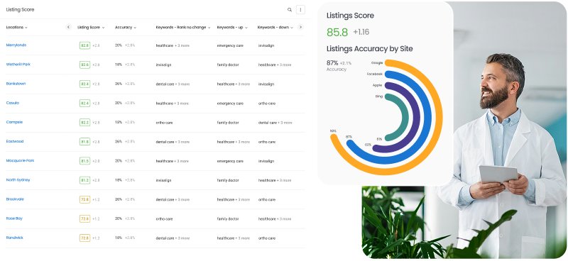 Take control of your online presence and discoverability across locations with powerful insights into the accuracy of your online listings and Google Business Profiles. Track keyword rankings to boost local SEO.