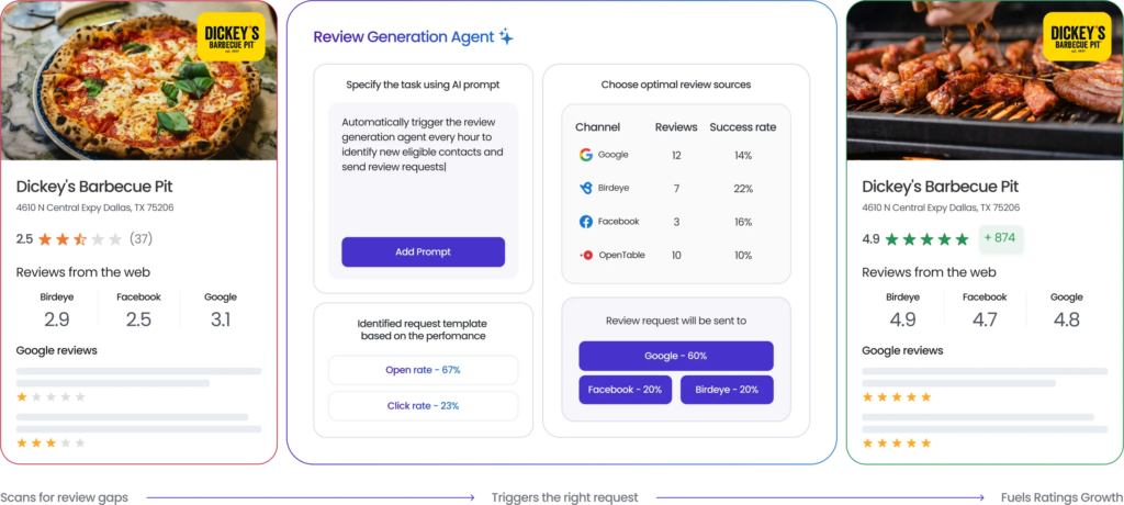 Real estate agents often receive reviews across Google, Zillow, Facebook, and other platforms. Birdeye’s Reviews AI agents centralize and automate reputation management across all these channels: