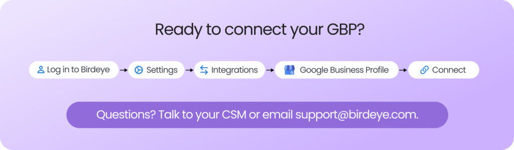 If you’re a Birdeye customer and want help connecting your Google accounts, reach out to your CSM or contact us at support@birdeye.com. We’ll get you set up.