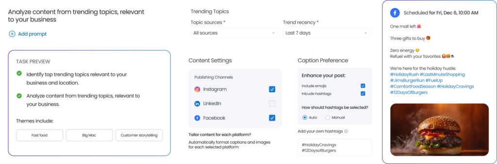 The Social Publishing Agent generates captions, recommends visuals, and schedules posts across multiple social accounts while ensuring brand consistency. It also analyzes local trends and sentiment signals to create content that resonates with regional audiences.