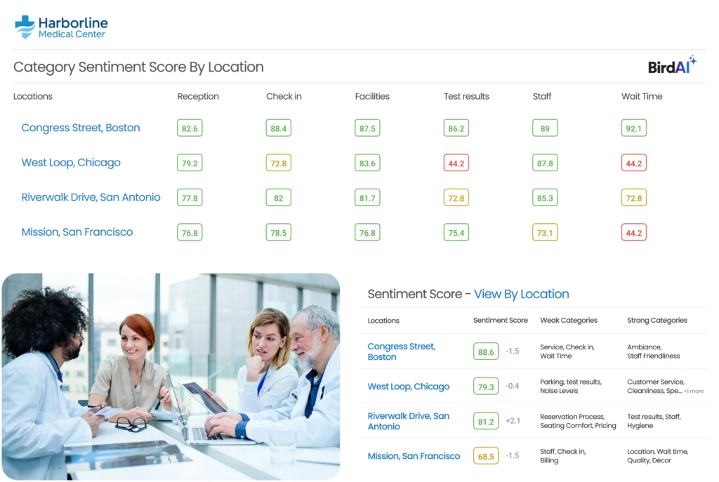 Birdeye’s Insights AI analyzes reviews, surveys, and customer feedback across locations to uncover patterns and emerging trends. This helps insurance organizations identify what customers value most, where service improvements are needed, and which locations are outperforming others.