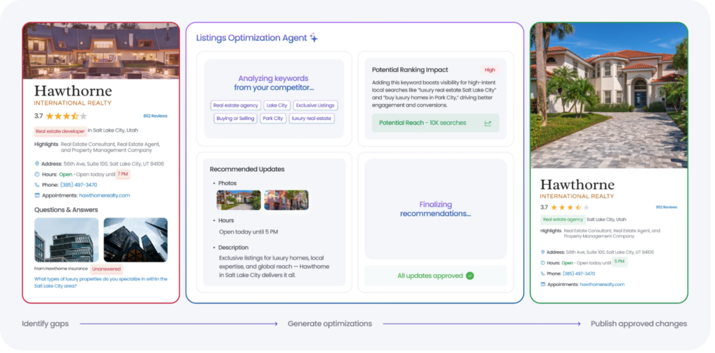 The Listings Optimization Agent continuously audits location profiles, identifies missing attributes or inconsistencies, and recommends updates to strengthen local search visibility.
