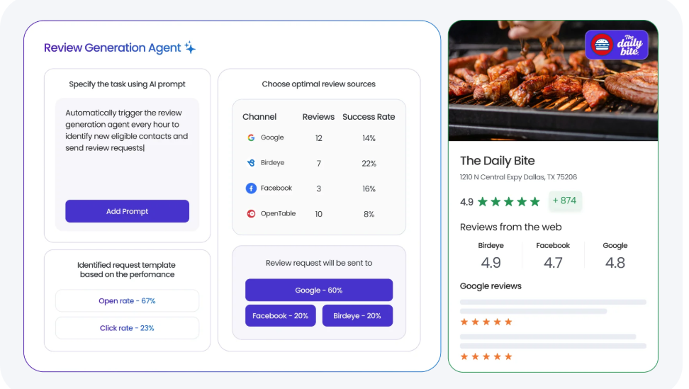 Reviews are one of the strongest trust signals in local discovery, but generating and managing them across locations can become manual fast. Birdeye’s Reviews AI helps brands request more reviews at the right time, respond with context, and surface review insights that help teams understand what is driving sentiment and conversion. Birdeye says Reviews AI agents automate review requests, responses, and insights, and its review product page positions them around turning reputation into revenue.